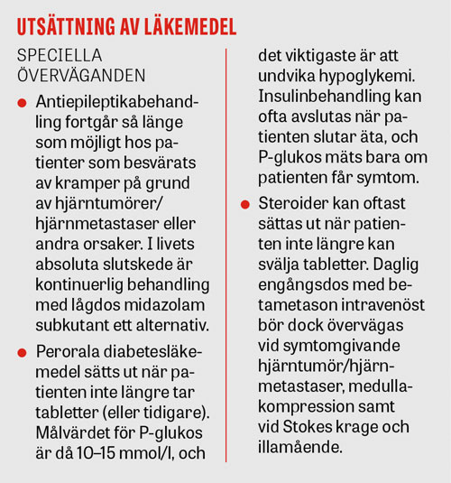 Under livets absoluta slutskede klarar patienten inte längre att ta perorala läkemedel, vilket blir en »naturlig« väg att sätta ut behandlingen. Det är då angeläget att sätta in parenterala beredningsformer av analgetika, antiemetika, anxiolytika och andra rent symtomlindrande läkemedel.