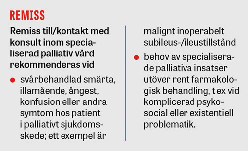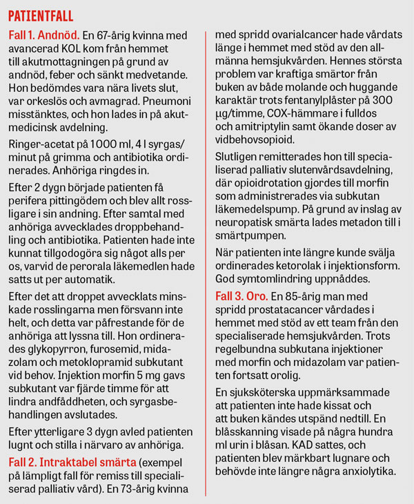 Denna artikel är riktad gentemot teamet som vårdar patienten utanför den specialiserade palliativa vården, t ex inom den allmänna hemsjukvården och på akutsjukhus. Råden är allmängiltiga och inte diagnosspecifika. Cancer har länge stått i fokus för den specialiserade palliativa vården, men kunskapen är applicerbar också på andra diagnosgrupper.