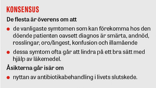 I livets slutskede är det inte ovanligt att patienter besväras av smärta, illamående, andnöd/rosslingar, oro/ångest eller konfusion. Baserat på ett synsätt där möjliga mekanismer eftersöks och bakomliggande orsaker behandlas är det ofta möjligt att med relativt enkla farmakologiska åtgärder lindra dessa symtom på ett tillfredsställande sätt.