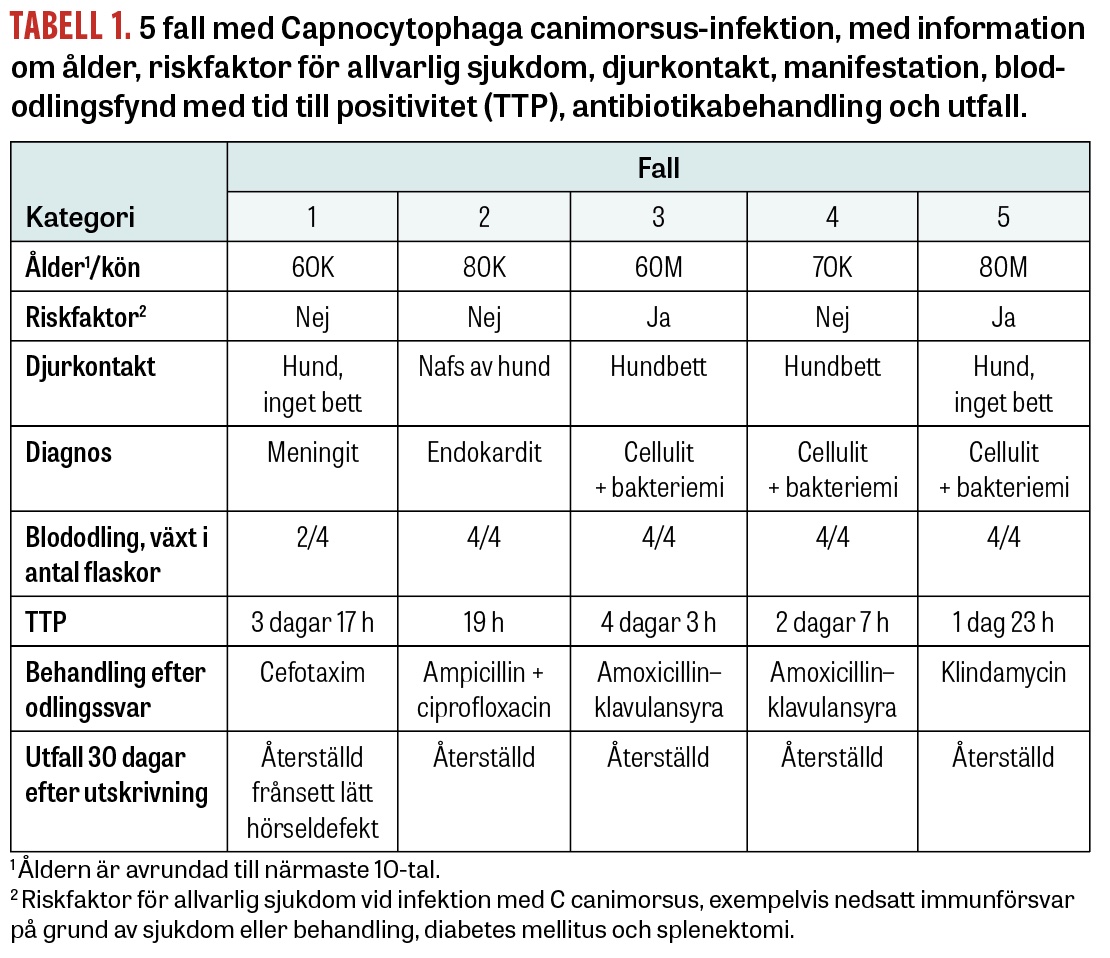 Capnocytophaga canimorsus är en gramnegativ stav som tillhör munfloran hos hund och katt [1]. Den beskrevs 1976 som orsak till meningit och sepsis efter hundbett [2] och finns väl beskriven som orsak till fulminant sepsis efter hundbett, i synnerhet hos individer med bortopererad mjälte eller alkoholmissbruk. 2010 publicerade kollegor vid infektionskliniken i Örebro en fallrapport, där ett fall med misstänkt meningit beskrevs [3]. Fall av endokardit är ovanliga [4, 5]. Inkubationstiden är vanligen kortare vid sepsis (1–4 dagar) än vid lokaliserad mjukdelsinfektion (4–14 dagar) [1]. Vid fallgenomgångar framkommer att ca 50–60 procent har anamnes på nyligt hundbett, medan 10–30 procent uppger mindre rivmärken, att de blivit slickade av hund eller enbart varit i kontakt med hund. Fall utan uppenbar djurkontakt förekommer. Incidensen för C canimorsus-bakteriemi har i europeiska studier angetts till 0,5–0,67 fall per miljon invånare [6]. På avdelningen för laboratoriemedicin vid Östersunds sjukhus identifierades 5 fall av C canimorsus-bakteriemi under 3 månader (juli till september) 2022. Senaste fallet dessförinnan inträffade 2015. Vi beskriver fallen, varav ett presenterade sig som meningit och ett bedömdes ha endokardit (Tabell 1).
