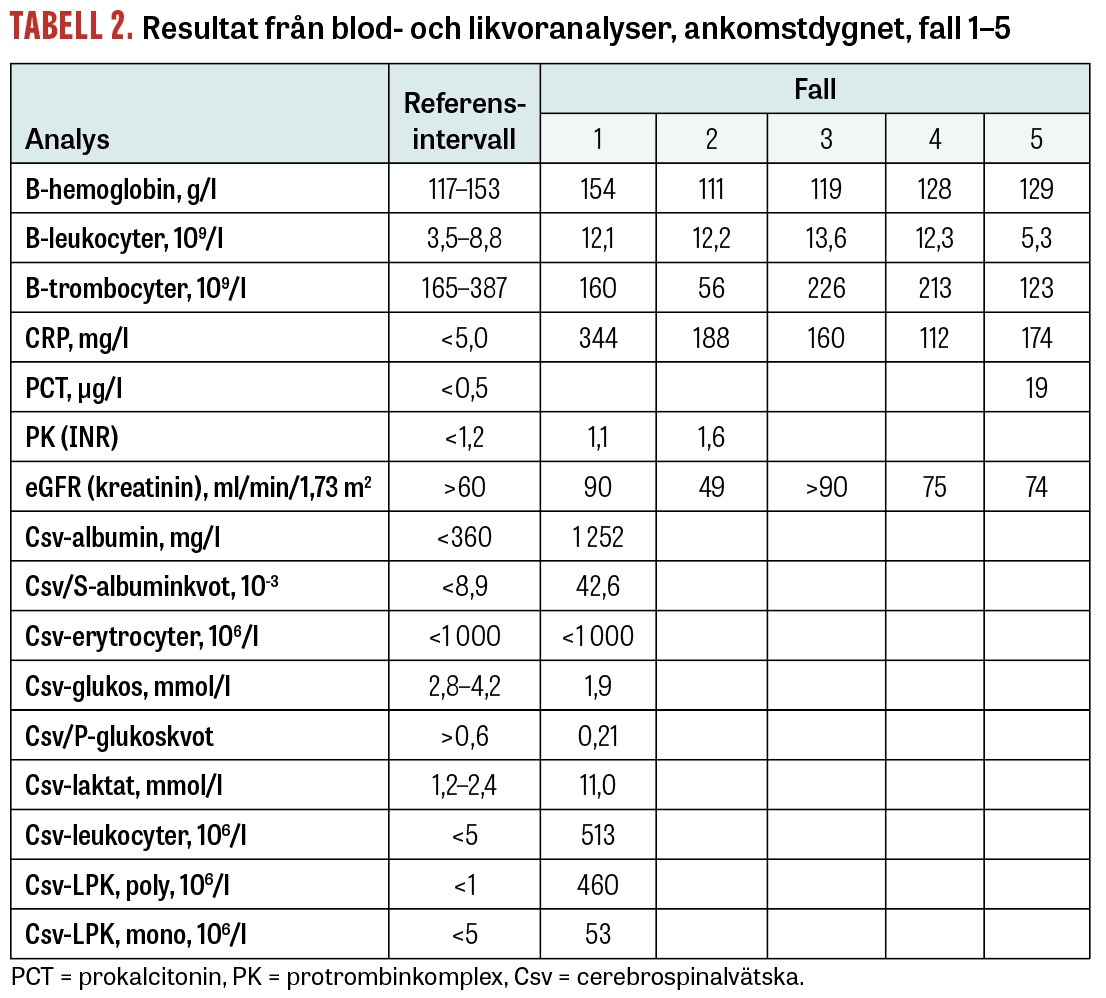Hon hade påträffats okontaktbar med blå läppar av maken, som berättade att hon haft feber samt kraftig huvud- och nackvärk de senaste 2 dagarna. Hon vaknade till och gick själv ut till ambulansen, men var sig inte lik: hon kommunicerade inte verbalt och tedde sig rädd och misstänksam. Vid ankomst till akutmottagningen var hon febril, och i status noterades nackstyvhet, varför meningit misstänktes. Efter blododlingar gavs betametason 8 mg och meropenem 2 g. DT hjärna utföll normal, och lumbalpunktion genomfördes med klar likvor i utbyte. I likvor sågs pleocytos med polyövervikt förenlig med bakteriell meningit (Tabell 2). Tryckmätning visade ett likvortryck på 25 cm H2O. Behandlingen fortsatte med betametason 8 mg × 4 och meropenem 2 g × 3. PCR-analys (Filmarray) av likvor utföll negativ för de 14 patogener som ingår i panelen. Patienten beskrev nytillkommen hörselnedsättning på vänster öra, vilket bekräftades med audiometri. Dag 4 kom larm om växt av långsmal gramnegativ stav i de anaeroba blododlingsflaskorna, och typen C canimorsus identifierades med masspektrometri (MALDI-TOF). För att smalna av från karbapenem, men fortsättningsvis ge ett preparat där det finns stor erfarenhet vid meningit samt där sannolik känslighet föreligger hos C canimorsus, byttes meropenem till cefotaxim 3 g × 4. Efter 4 dagars cefotaximbehandling tillkom makulösa kliande exantem över bålen och armarna samt stickningar i munnen, vilket tolkades som reaktioner på betalaktam. Behandlingen byttes därför tillbaka till meropenem 2 g × 3 med total behandlingstid på 14 dagar. Det framkom att hon har hund, men inte hade blivit biten eller umgåtts nära den. 16S rRNA-analysen (sekvensering av ribosomalt RNA för att bestämma vilken/vilka bakterier som finns i ett kliniskt prov) av likvor visade bakteriellt DNA tillhörande C canimorsus. Vid uppföljning efter en månad var patienten återställd förutom lätt kvarstående hörselnedsättning.