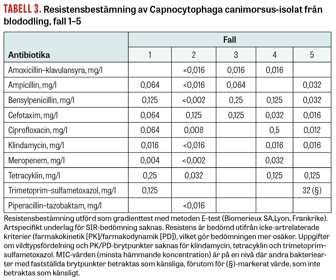 De presenterade fallen av allvarlig infektion orsakad av C canimorsus är ovanliga i klinisk vardag, men välkända manifestationer i litteraturen. Capnocytophaga beskrivs som långsamväxande bakterier, men i ett av våra fall larmade blododlingar redan inom ett dygn, och alla isolat kunde artbestämmas med MALDI-TOF [5-7]. C canimorsus är känslig för penicillin, ampicillin, klindamycin och kinoloner, men okänslig för flukloxacillin/kloxacillin och aminoglykosider (Tabell 3). Andra arter av Capnocytophaga kan uppvisa betalaktamasproduktion, varför cefotaxim rekommenderas vid allvarlig infektion och amoxicillin‒klavulansyra vid peroral behandling tills art- och resistensbestämning föreligger [6, 8]. Antibiotikaprofylax rekommenderas <24 timmar vid katt- och hundbett som är lokaliserade i ansiktet, vid bett i direkt anslutning till led och till patienter som är immunsupprimerade, men randomiserade studier saknas [8]. Hundkontakt förelåg i alla fem fallen, även om bett enbart kunde verifieras hos två.