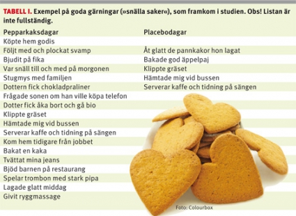 Exempel på snällhet. De externa bedömarna uppmanades också att ge exempel på »snälla saker« studiedeltagarna gjort under studieperioden. Ofta var kommentarer om godhet kopplade till höga poäng samma dag. Exempel på goda gärningar under pepparkaksdagar och under placebodagarna listas i Tabell I. Det fanns en tendens till att fler goda gärningar listades under dagar när studiedeltagarna ätit pepparkakor, men detta resulterade inte i högre poäng.