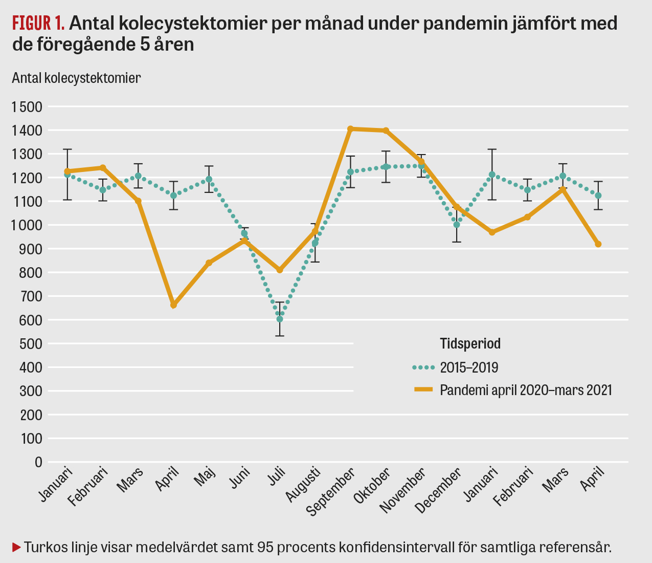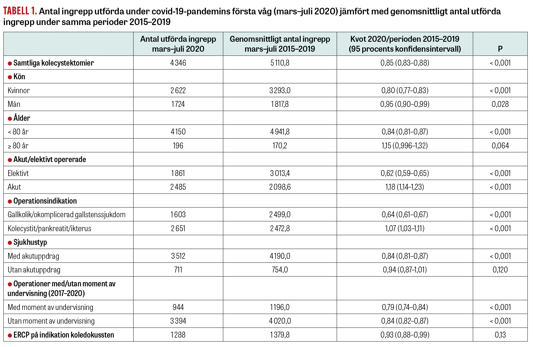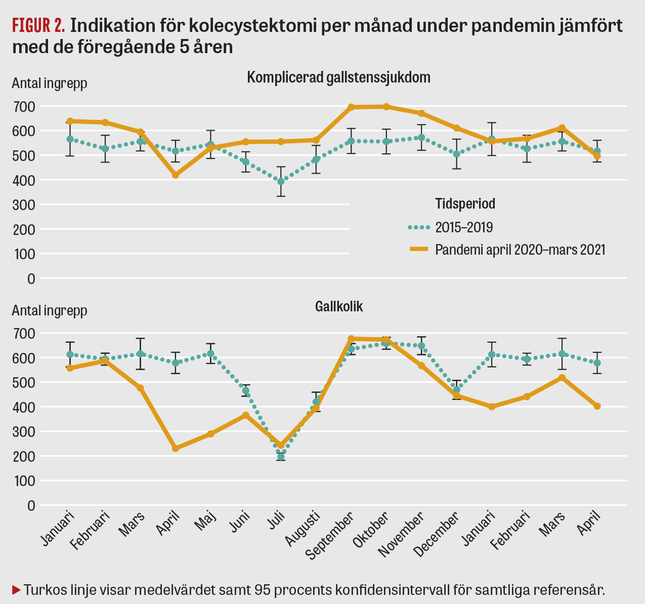 Det genomsnittliga antalet kolecystektomier per månad under studieperioden 2020–21 jämfördes med genomsnittet för perioden 2015–2019 (Figur 1). Vi gjorde också en indelning i indikation för kirurgi (akut operation på grund av komplicerad sjukdom respektive elektiv kirurgi på grund av gallkolik), kön, ålder (≤80 vs >80 år), kirurgisk teknik (laparoskopisk eller öppen operation), om man blev opererad på ett sjukhus med akut verksamhet eller ett enbart med planerad verksamhet samt hur antalet utbildningsoperationer (det vill säga att den som utbildas utför hela eller delar av operationen under handledning) påverkades (Tabell 1 samt Figur 2 och 3).