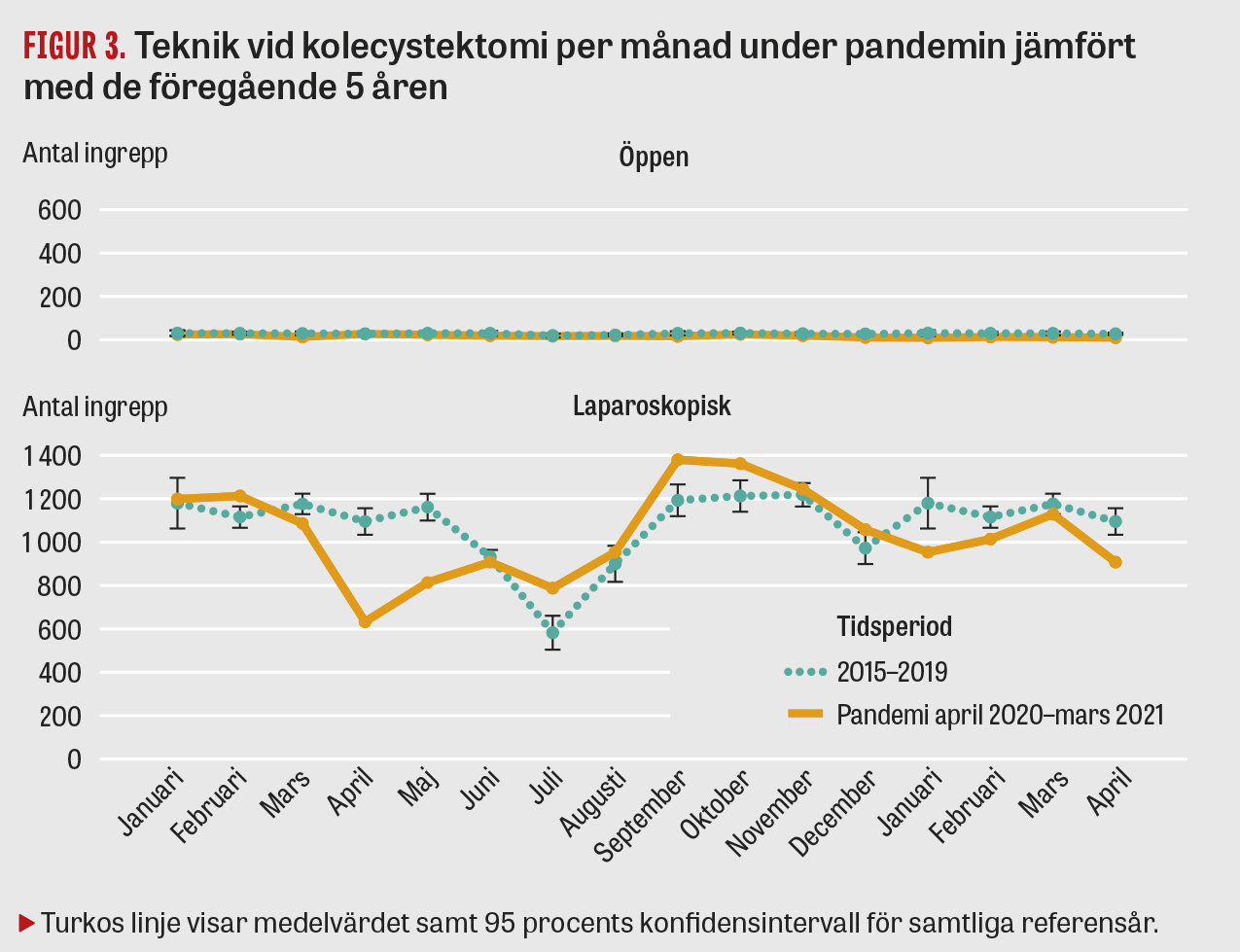 Tidigt under pandemin rådde viss förvirring kring tolkningen av riktlinjer från bland annat brittiska Royal College of Surgeons om att i möjligaste mån undvika laparoskopisk kirurgi [15, 16]. Den laparoskopiska tekniken förmodades leda till risk för spridning av covid-19 på grund av aerosolbildning på operationssalen. Dessa riktlinjer reviderades dock ganska snart, vilket avspeglas i data från Gallriks som visade en återgång till en generellt ökande andel laparoskopiska kolecystektomier redan efter 2–3 månader (Figur 3). Här kan noteras att det faktiska antalet öppna operationer totalt sett är betydligt lägre än antalet laparoskopiska operationer, varför skillnaderna i volym för de öppna ingreppen blir ganska små i absoluta tal.