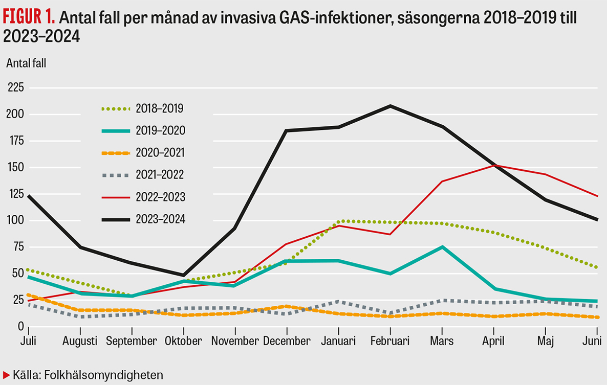 Under 2023 och 2024 har vi haft en markant ökning av antalet fall av invasiva infektioner med grupp A-streptokocker (GAS) i Sverige. Antalet fall brukar sjunka under sommarmånaderna, och nu verkar också epidemikurvan minska från en toppnivå i februari månad, men den ligger fortfarande på en förhållandevis hög nivå. Invasiv GAS-infektion är en mycket allvarlig sjukdom med ofta snabbt förlopp och hög dödlighet. Både hög och låg ålder är riskfaktorer för sjukdom [1], vilket syns i rapporteringen med högst incidens bland äldre >70 och barn <10 år, men den kan drabba alla åldrar och även tidigare helt friska individer. Under 2023 rapporterades i Sverige 810 fall av invasiva GAS-infektioner, och fram till och med juni i år har 960 fall rapporterats (Figur 1) [2]. En liknande situation med hög förekomst har setts i andra europeiska länder, inklusive Frankrike, Nederländerna och Storbritannien [3]. Det troligaste är att detta är en postpandemisk effekt av att smittspridningen ökade när kontaktmönster i samhället normaliserades, i kombination med en minskad immunitet i befolkningen till följd av lägre exponering för grupp A-streptokocker under pandemin.