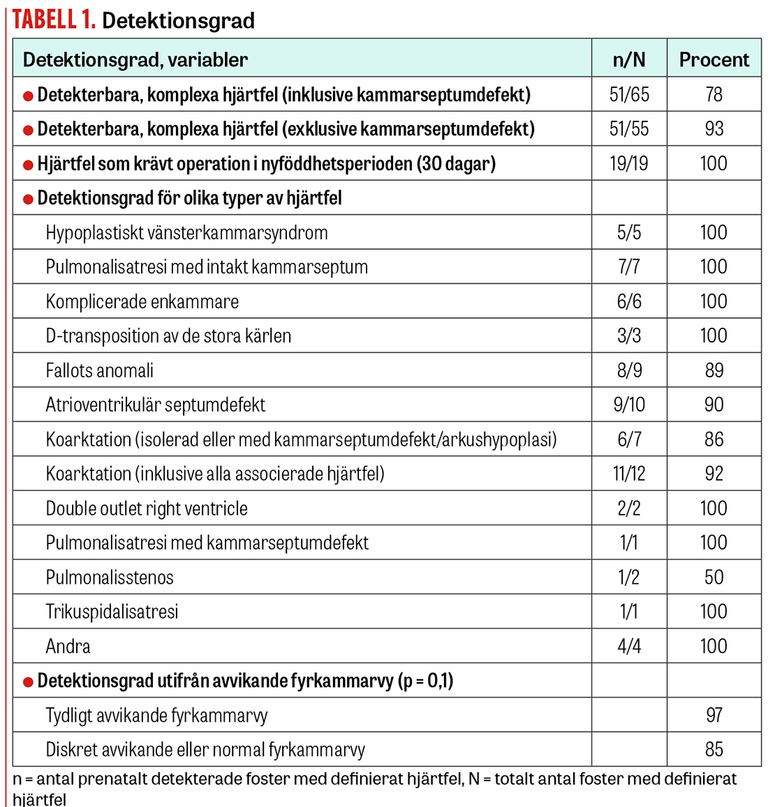 Av totalt inkluderade 65 fall identifierades 51 fall prenatalt (78 procent). Vid exklusion av fall med isolerad kammarseptumdefekt (n = 10) identifierades 51 av totalt 55 fall, motsvarande en detektionsgrad på 93 procent. Detektionsgraden bland foster utan kromosomavvikelse och extrakardiella missbildningar var 32/43 (74 procent) inklusive kammarseptumdefekt och 32/35 (91 procent) exklusive kammarseptumdefekt.