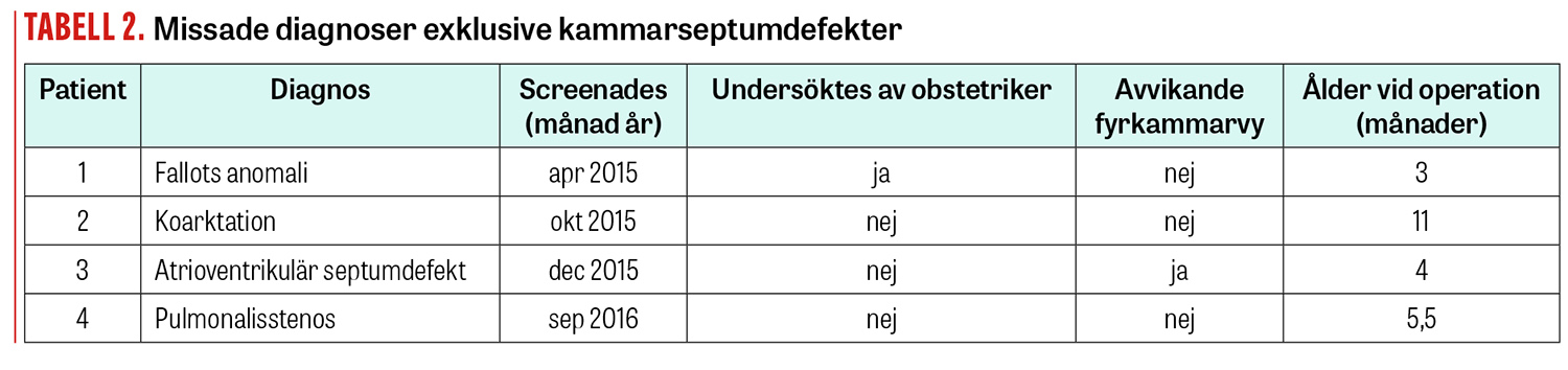 3 av de totalt 4 missade fallen med hjärtfel screenades under implementationsåret 2015. Med undantag för ett foster med atrioventrikulär septumdefekt kunde dessa hjärtvitier inte ses vid eftergranskning i fyrkammarvyn. Det fanns dock ingen signifikant skillnad i detektionsgrad av hjärtfel med tydligt avvikande fyrkammarvy jämfört med dem som kräver tillägg av andra projektioner såsom utflödesvyer (97 procent vs 85 procent; P = 0,1). I ett av de fyra missade fallen hade kvinnan undersökts och friats enligt steg 2 av specialiserad obstetriker (Tabell 1 och 2).
