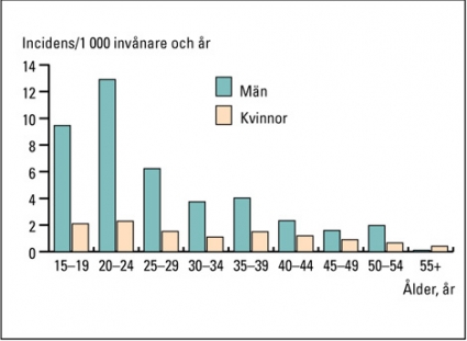 I vår studie var unga män oftast utsatta för våld, vilket också visats i flera andra studier [4-7]. Efter 25-årsåldern minskade skadeincidensen med stigande ålder, möjligen beroende på att äldre män i mindre utsträckning befinner sig på de platser och i de situationer där våld ofta förekommer, tex uteställen under helger och kvällar. Män utgjorde nästan fyra femtedelar av skadefallen, vilket stämmer väl överens med andra studier av våld mellan personer [7-9].