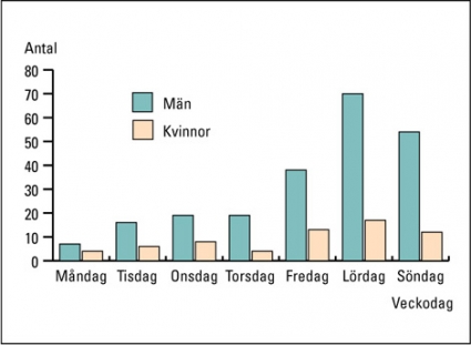 Då det gäller skademånad visar olika studier på olika mönster, men överlag kan en ökad frekvens ses under sommarmånaderna [1, 7, 9, 11], vilket även vår studie indikerade. Beträffande veckodag och tidpunkt för skadehändelsen stämmer våra iakttagelser väl överens med vad man funnit i andra studier; de flesta våldshändelserna sker under veckoslut och från kväll till tidig morgon [4-6, 12]. Eftersom flertalet våldshändelser inträffat på, eller i närheten av, pubar och nattklubbar kan man misstänka att alkoholpåverkan är en viktig faktor, vilket visats i andra undersökningar [6, 13-15].