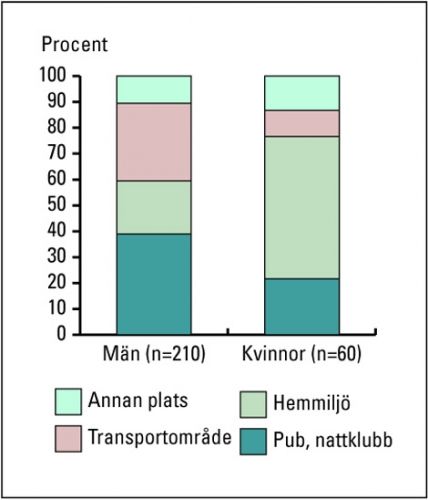 Män skadades oftast på pubar, nattklubbar och restauranger (39 procent) eller inom transportområden (30 procent), exempelvis trottoarer, gator och parkeringar. Kvinnor skadades oftast i hemmiljö (55 procent) (Figur 3).