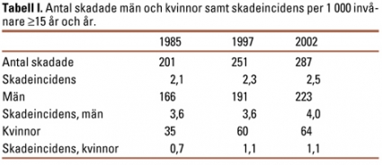 Under år 2002 behandlades 287 personer från 15 års ålder och uppåt för våldsrelaterade skador på NUS: 223 (78 procent) män och 64 (22 procent) kvinnor. Skadeincidensen för 2002 var 2,5/1000 invånare och år, vilket är en liten ökning jämfört med 1997 och 1985 (Tabell I). År 2002 var skadeincidensen högst i åldersgruppen 20–24 år (13,1/1000 invånare och år) för män, för att sedan sjunka med stigande ålder, medan den var relativt jämn för kvinnor (Figur 1). Flest män skadades under sommarmånaderna, vilket även var fallet år 1997. En majoritet av både män (73 procent) och kvinnor (66 procent) skadades fredag till och med söndag (Figur 2); en liknande fördelning sågs 1997. I de fall där tidpunkten för skadan var känd hade 80 procent av männen och 64 procent av kvinnorna skadats mellan klockan 22.00 och klockan 04.00.