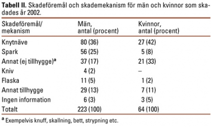 Skademekanismen kategoriserades utifrån vad som orsakat den allvarligaste skadan. Den vanligaste skademekanismen för både män och kvinnor var knytnävsslag. 44 män skadades med tillhygge, oftast flaska eller kniv (Tabell II). Andra tillhyggen som användes var basebollträ, yxa, machete, sabel, batong och järnrör. En man blev skjuten genom handen. Åtta kvinnor skadades med olika tillhyggen (skor, hammare och kvastskaft). Åtta män och sju kvinnor hade 2002 blivit utsatta för stryptag eller strypningsförsök, och tio män hade blivit skallade. Det totala antalet skador var 519, i genomsnitt 1,8 skador/person. Både 2002 och 1997 var huvud och övre extremiteter de kroppsdelar som oftast skadades hos både män och kvinnor. För män var 68 procent av skadorna lokaliserade till huvud/hals och nacke och 15 procent till övre extremiteterna. Kvinnor hade en lägre andel skador i huvud/hals och nacke (49 procent) och en högre andel på övre extremiteter (28 procent). Även detta stämmer väl överens med resultaten från 1997.