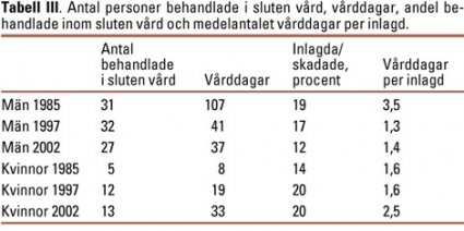 Under 2002 vårdades 27 män i sluten vård i totalt 37 dygn. 13 kvinnor behandlades i sluten vård i totalt 33 dygn. En kvinna vårdades åtta dygn efter det att hon blivit slagen ett flertal gånger i huvudet med en hammare av sin exmake. Flest vårddagar (13) hade en kvinna som hoppade från en balkong på andra våningen efter det att hon blivit hotad av sin make. För män minskade och för kvinnor ökade antalet dagar i sluten vård jämfört med 1985 (Tabell III).