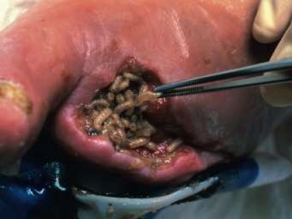 I en observationsstudie prövades hos 13 vuxna diabetiker med kroniska fotsår, koloniserade med MRSA, om behandling med fluglarver kunde eradikera MRSA. Neuropatigrad och perifer cirkulation utvärderades. MRSA-kolonisation definierades som sårodling med fynd av MRSA hos patient utan kliniska och laboratoriemässiga tecken på generell infektion och utan antibiotikabehandling mot MRSA.