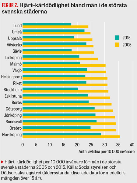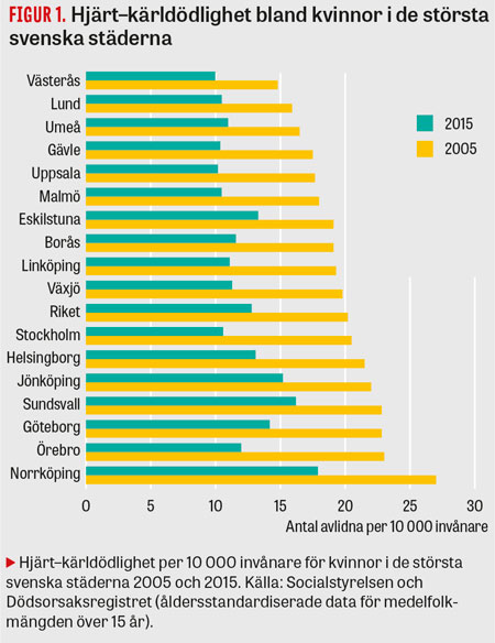 Hjärt–kärlsjukdom var för ett decennium sedan, och är fortfarande, den mest dominerande dödsorsaken i Sverige. Men hjärt–kärlsjukdomarna har efter hand minskat, vilket kan ses i många länder [9]. I ett 10-årsperspektiv framgår detta även tydligt för både män och kvinnor i de största svenska städerna. Man bedömer att minskningen beror på bättre diagnosmöjligheter och nya läkemedel men även på att rökningen minskat och att befolkningen har sundare kost- och motionsvanor [9]. Hjärt–kärldödligheten har också totalt sett gått ner hos befolkningen i tvillingstäderna Linköping och Norrköping. För 10 år sedan var dödligheten i hjärt–kärlsjukdomar för kvinnor i Norrköping omkring 30 procent högre än för Linköpingskvinnorna [1]. Trots den nedåtgånde mortalitetstrenden visar vår analys i dag att skillnaden mellan städerna vad gäller dödlighet för kvinnor inte har minskat, utan tvärtom ökat till att nu vara ca 60 procent högre hos Norrköpingskvinnor. Hjärt–kärldödligheten hos män var omkring 30 procent högre i Norrköping för 10 år sedan. Denna skillnad har snarast ökat till i dag 38 procent högre för Norrköpingsmän.