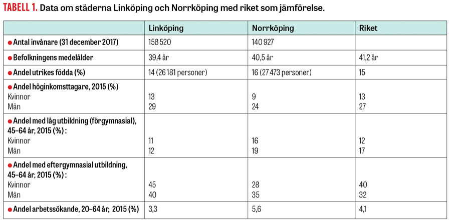 Att studera folkhälsan och vilken betydelse olika sociala, ekonomiska och kulturella förhållanden har för människors hälsa och för riskerna att drabbas av sjukdomar är komplicerat därför att orsakssammanhangen ofta är så komplexa. Det kliniska experimentet har ofta betraktats som en förebild, själva urtypen, för god forskning. Men denna naturvetenskapliga idealsituation existerar knappast i samhällsmedicinsk eller folkhälsovetenskaplig forskning. Tvillingstudier är inom medicinen en klassik studiedesign för att utröna den relativa betydelsen av arv respektive miljö. Jämförelsen av folkhälsan i »tvillingstäderna« liknar de klassiska tvillingstudierna, men tillämpat i ett större samhällsmedicinskt perspektiv där fokus ligger på den relativa betydelsen av den sociala miljön för folkhälsan. I vår samhällsmedicinska design jämför vi folkhälsan i de båda östgötastäderna Norrköping och Linköping. Dessa ligger endast fyra mil från varandra och är relativt jämnstora befolkningsmässigt. Linköping brukar betecknas som »den stora småstaden« och Norrköping som »den lilla storstaden«. Linköping och Norrköping kan utifrån storlek och geografiskt läge betraktas som tvillingstäder. De ligger inom samma landstingsområde och har en likartad hälso- och sjukvårdsstruktur. Det finns likheter, men också viktiga skillnader mellan städerna. Som framgår av Tabell 1 är invånarantalet något högre i Linköping, men åldersstrukturen är likartad med ungefär samma medelålder i de båda städerna. Däremot skiljer sig den sociala strukturen något åt. Norrköping har något fler utrikes födda, färre höginkomsttagare, färre högutbildade och fler lågutbildade. Andelen arbetssökande är också större i Norrköpings befolkning (SCB: Befolkningsstatistik, Folkhälsomyndigheten: Folkhälsodata).