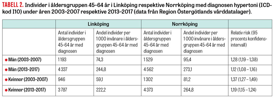 Hjärt–kärldödlighet är en god indikator på folkhälsan, men det är även intressant att studera riskpanoramat för hjärt–kärlsjuklighet. Den mest betydande och klassiska riskfaktorn för hjärt–kärlsjuklighet är hypertoni. För att komplettera folkhälsobilden har vi tagit fram data om andelen av den medelålders befolkningen (45–64 år) i tvillingstäderna med diagnostiserad hypertoni (ICD-kod I10) för omkring 10 år sedan respektive i dag, Tabell 2 (data är hämtade från Region Östergötlands vårddatalager). Andelen av befolkningen i tvillingstäderna med hypertonidiagnos har ökat kraftigt och närmast tredubblats under det senaste decenniet. En viktig förklaring till detta är att gränsvärdena och rekommendationerna för när diagnosen hypertoni ska sättas har sänkts, och tendensen är nog att dessa gränsvärden sänks ytterligare [10]. Det leder då naturligt till fler fall i en befolkning, vilket visas med exemplet från de båda tvillingstäderna. Skillnaderna mellan städerna i risken att få diagnosen hypertoni förefaller ha minskat något, Tabell 2. Omräknat i antal individer är det ändå närmare 1 000 personer fler med hypertonidiagnos i Norrköping i åldersgruppen 45–64 år. Det innebär att Norrköpings befolkning fortsatt har en ökad risk jämfört med Linköpings befolkning också för framtida hjärt–kärlsjuklighet.