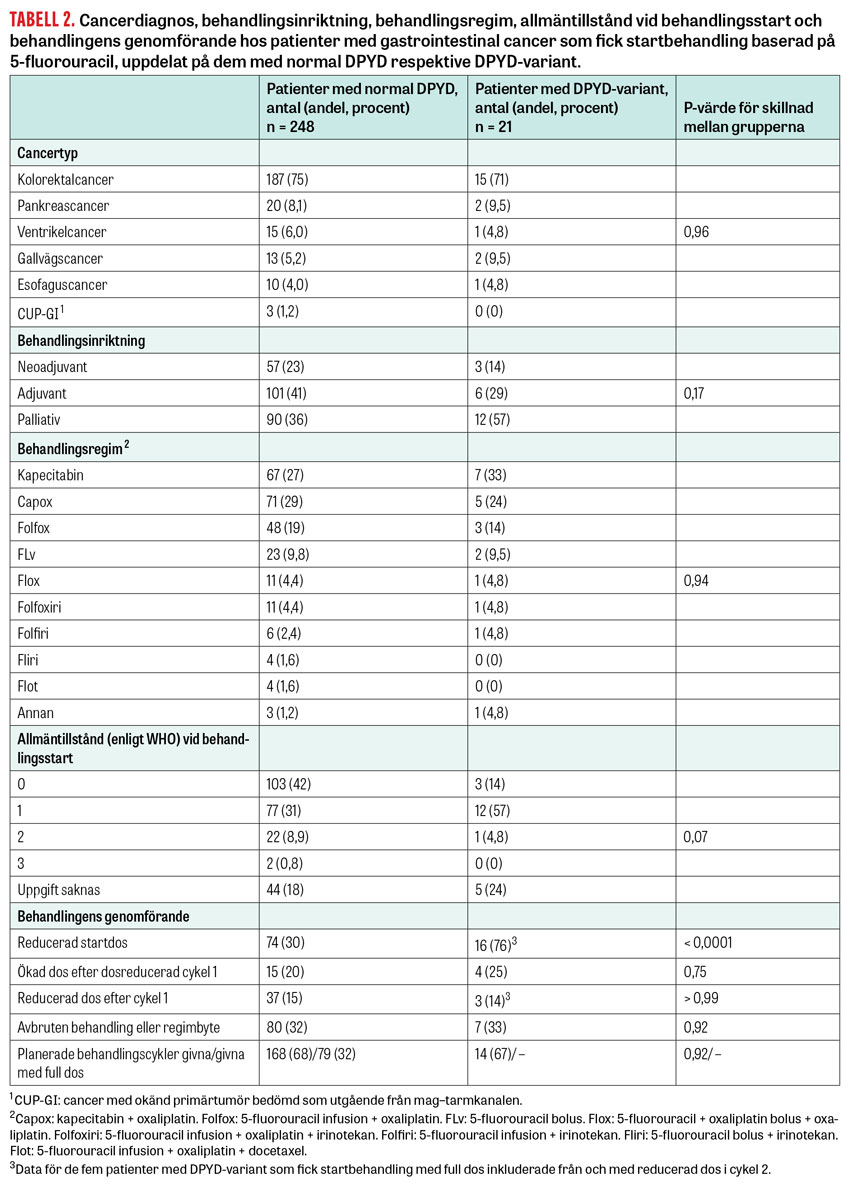 Hos 269 patienter med gastrointestinalcancer, 248 med normal DPYD och 21 med DPYD-variant, startades behandling baserad på 5-fluorouracil vid Akademiska sjukhuset eller lasarettet i Enköping, och de kunde följas upp avseende behandling och biverkningar. Patienter med DPYD-variant fick startbehandling med reducerad dos, vanligen 50 procent av standarddos, med undantag för 5 patienter för vilka testresultatet ännu inte förelåg inför behandlingsstart.