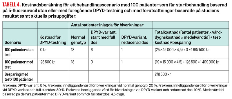 En kostnadsberäkning gjordes baserad på studieresultat samt kostnader för DPYD-testet och inneliggande vård. Vi utgick från ett scenario med 100 patienter som får startbehandling baserad på 5-fluorouracil utan eller med ett föregående DPYD-test (Tabell 4). Beräkningen indikerar att förebyggande testning ger en besparing på ca 280 000 kronor genom att inneliggande vård kan undvikas för majoriteten av patienter med DPYD-variant.