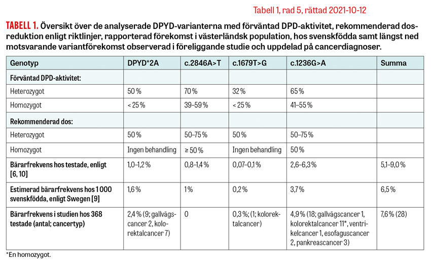 De fyra DPYD-varianterna förekom något oftare hos våra cancerpatienter jämfört med 1 000 svenskfödda kontrollpersoner: 7,6 respektive 6,5 procent [9]. Huruvida denna skillnad är slumpmässig eller uttryck för någon form av selektion är oklart. Standarddos av behandling baserad på 5-fluorouracil medförde påtagligt hög risk för allvarliga biverkningar hos patienter med nedsatt enzymaktivitet. Patienter med nedsatt enzymaktivitet som fick reducerad dos hade, till skillnad från i en tidigare liknande studie, något lindrigare biverkningsprofil jämfört med normalgruppen [7]. Förklaringen kan vara att den dosreduktion vi vanligen tillämpade (50 procent) var den mest konservativa och att försök till doshöjning efter den inledande behandlingscykeln var ovanliga.