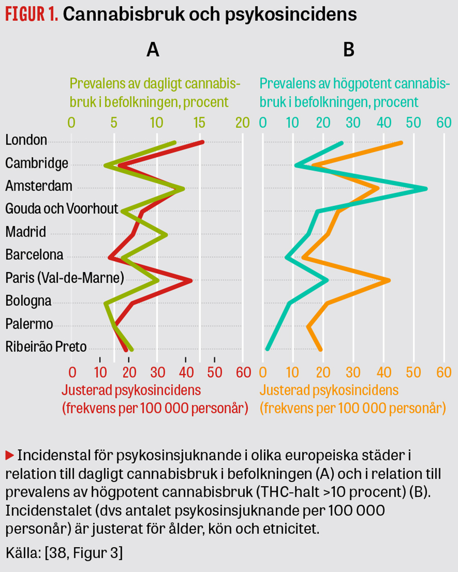 I en studie som omfattade 900 psykospatienter från Europa och Brasilien visades starka samband mellan dagligt bruk, eller bruk av cannabis med hög THC-halt, och psykosinsjuknade, se Figur 1 [38]. I London och Amsterdam förklaras en tredjedel respektive hälften av samtliga nyinsjuknanden i psykos med att personen har använt högpotent cannabis [39]. Trots att vissa typer av genetisk sårbarhet ökar risken för psykosutveckling flerfaldigt (3–5 gånger) [40] är det klarlagt att drogmissbruk utgör en oberoende riskfaktor för psykos [41]. Det finns stöd för att cannabis-associerade psykoser övergår i en kronisk schizofreni hos närmare hälften av de individer hos vilka den uppträder [42].