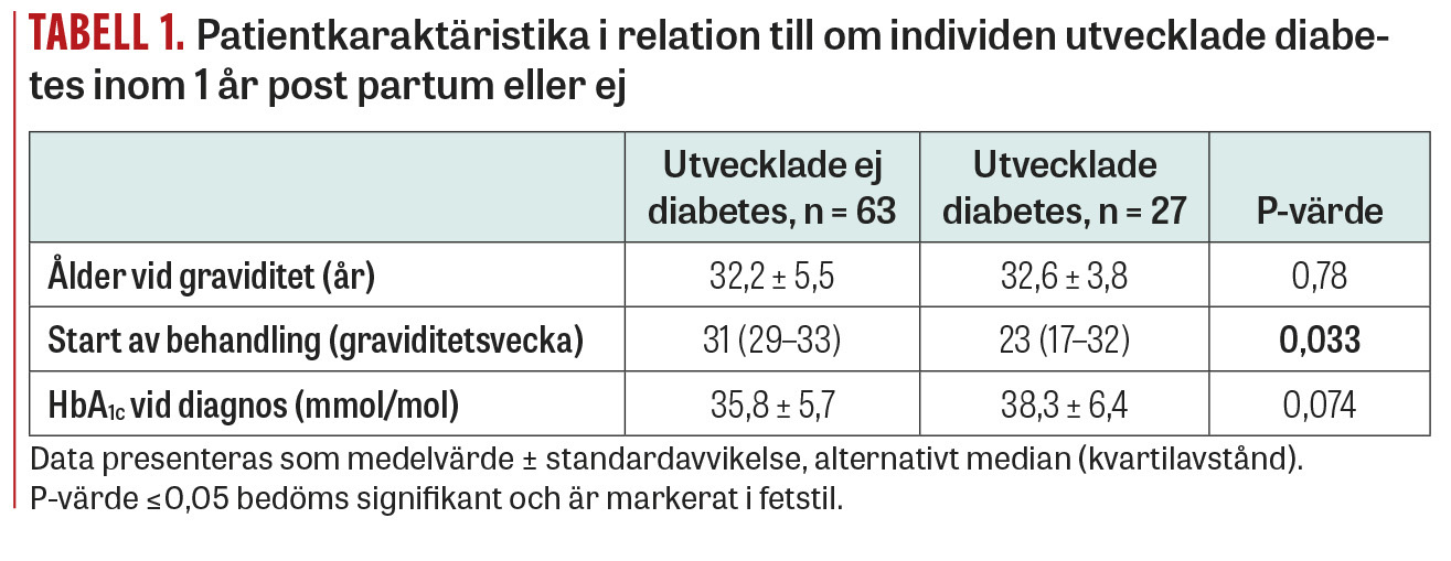 Av dem som deltagit i uppföljning utvecklade 20 procent (n = 27) diabetes inom 1 år. Vid jämförelse med dem som vid 12 månaders OGTT inte utvecklat diabetes sågs ingen signifikant skillnad i ålder (32,6 år respektive 32,2 år; P = 0,78) eller HbA1c vid tidpunkten för GDM-diagnos (38,3 respektive 35,8 mmol/mol, P = 0,074), men en skillnad i under vilken graviditetsvecka man startat blodsockersänkande behandling (v 23 respektive v 31; P = 0,033) (Tabell 1).