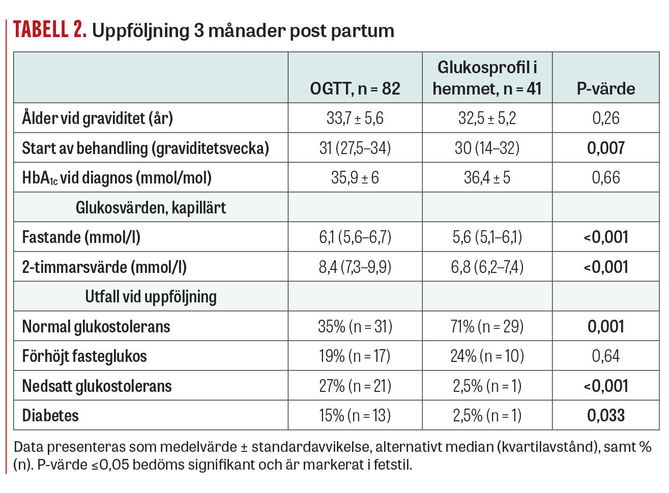 Vid uppföljning 3 månader post partum genomgick 82 individer OGTT och 41 individer glukosprofil i hemmet (Tabell 2). De som genomgick OGTT hade både högre fasteglukos (6,1 respektive 5,6 mmol/l; P = <0,001) samt 2 h-glukos (8,4 respektive 6,8 mmol/l, P = <0,001) än de som mätt glukosprofil i hemmet. Färre individer som genomgick OGTT utföll med normal glukostolerans (35 procent gentemot 71 procent; P = 0,001) och fler fick diabetesdiagnos (15 procent respektive 2,5 procent; P = 0,033). Förekomst av IFG var likvärdig mellan grupperna (19 procent respektive 24 procent; P = 0,644). Förekomsten av IGT var högre i gruppen som genomgick OGTT (27 procent respektive 2,5 procent; P = <0,001) (Figur 1).