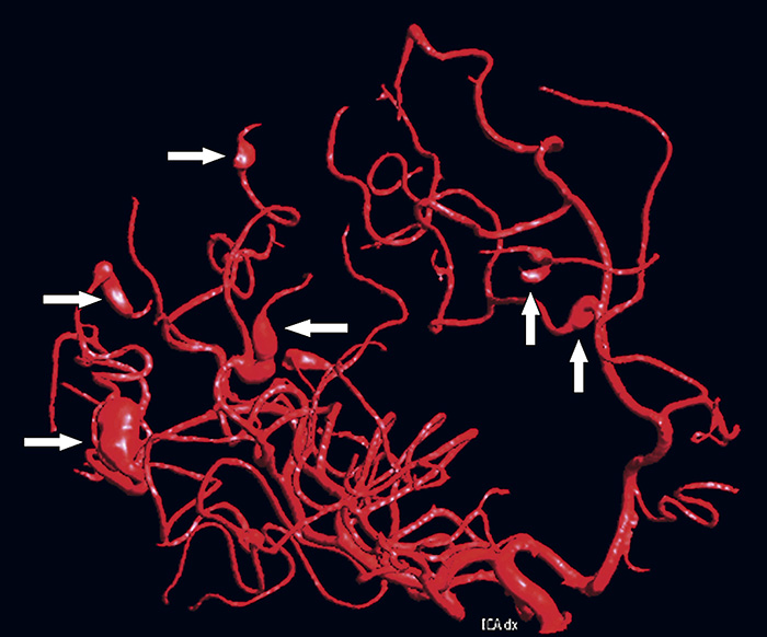 Figur 1. Tredimensionell rotationsangiografi av hjärnans kärl med injektion i höger a carotis interna. På bilden ses multipla fusiforma kärlvidgningar i perifera grenar av a cerebri media och anterior (pilar).