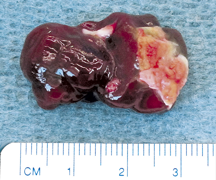 Operation ska utföras så snart som möjligt för att minimera risken för embolisering [1]. Myxom utgår vanligen från en fibrovaskulär stjälk eller ett begränsat endokardområde i vänster förmaks septumvägg. Det är en oregelbundet rundad blå-röd tumör med glänsande yta med gelatinös sönderfallande konsistens (Figur 2). När diagnosen ställs har myxomet ofta en diameter på 3–8 cm. Det cellulära ursprunget till myxom anses vara differentiering från mesenkymala celler eller endotel. Vid mikroskopi ses rikligt med myxoid stroma och spridda spolformade celler utan atypier. Kirurgi vid förmaksmyxom är botande och innebär låg risk för komplikationer. Eftersom endokardiet i vänster förmak delvis tagits bort inom en liten yta vid operationen bör patienten behandlas upp till två månader med acetylsalicylsyra 75–160 mg × 1. Vid förmaksarytmier ska antikoagulation övervägas.