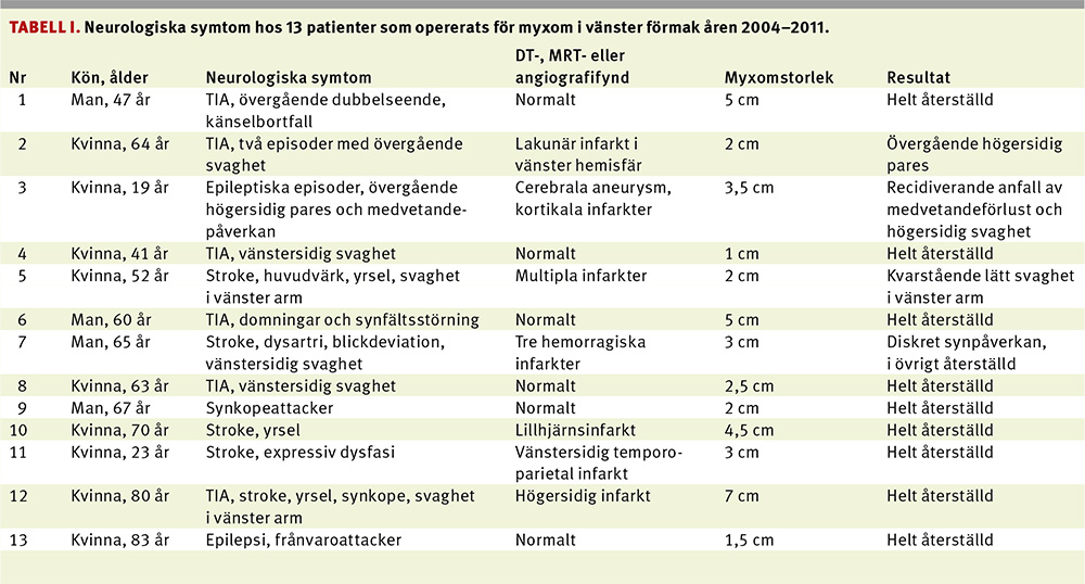 Under åren 2004–2011 opererades 36 patienter för myxom på Karolinska universitetssjukhuset i Solna. Hos 13 av dem (36 procent) var debutsymtomen akut neurologiska – tio insjuknade med TIA eller stroke, två hade epileptiska anfall och en synkope. Efter ekokardiografisk diagnos opererades samtliga. Inga recidiv har påvisats. Tre representativa fall beskrivs nedan. De 13 fallen sammanfattas i Tabell I.
