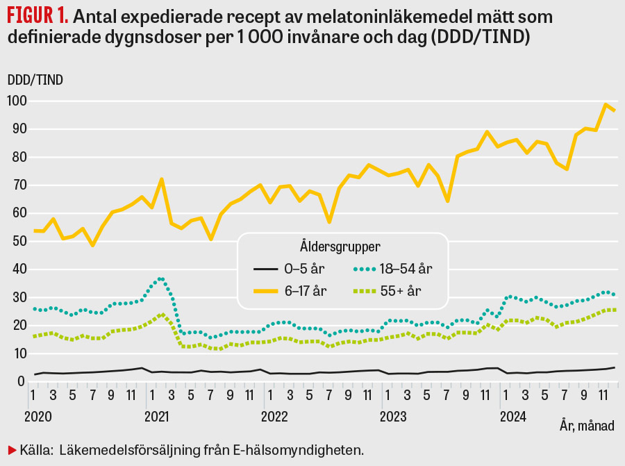 Tidigare kartläggningar har visat att användningen av melatonin på recept ökat dramatiskt under de senaste 10 åren hos barn och ungdomar i Sverige och i övriga Norden [6-8]. Även hos vuxna har förskrivningen av melatonin ökat [9].