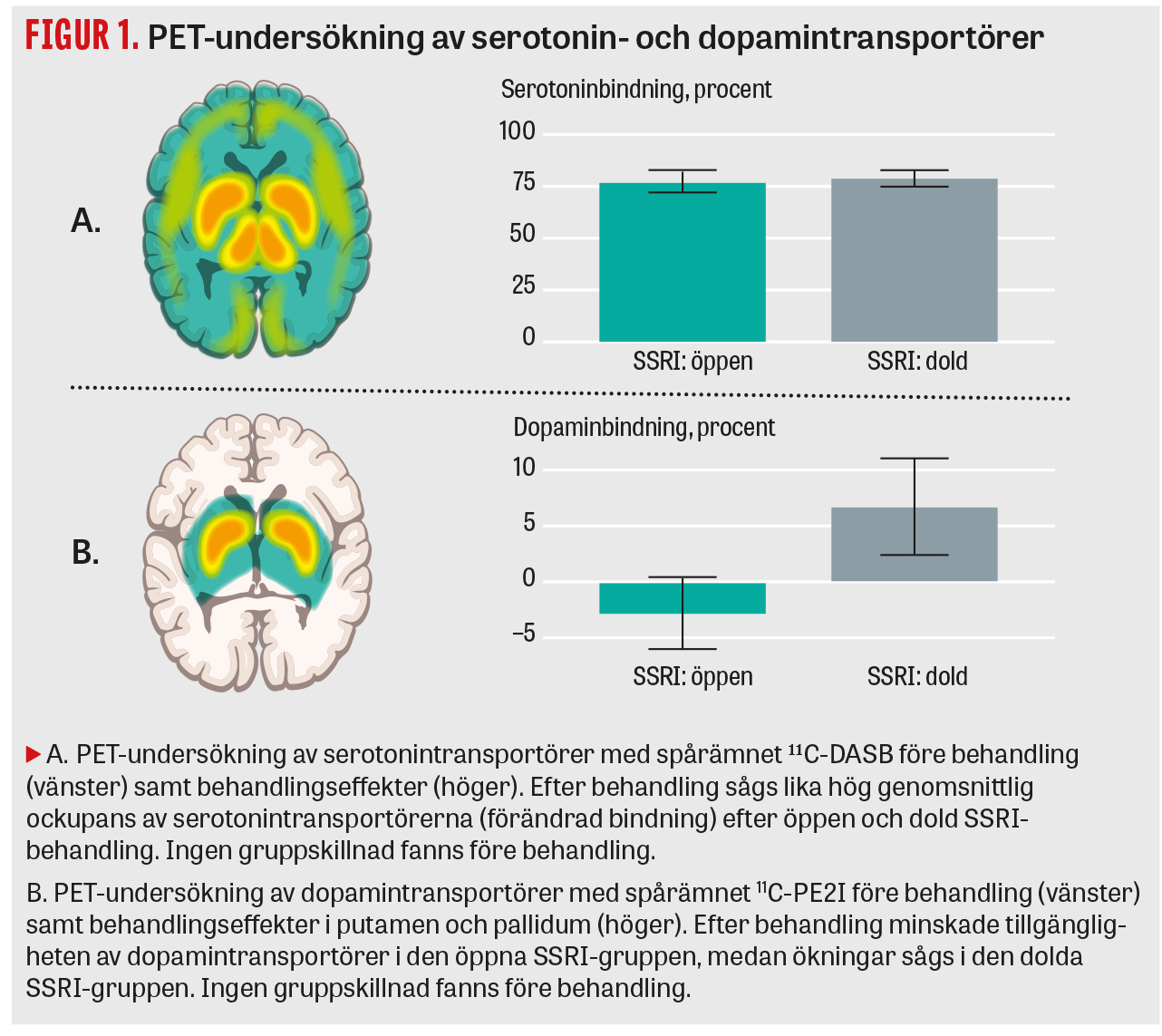 Ett PET-stickprov togs ur den större gruppen, bestående av 18 män och 9 kvinnor. Av dem fick 14 Cipralex öppet med korrekt information och 13 Cipralex dolt i kapslar tillsammans med »skenhistorian«. PET gjordes före och efter behandlingen med specifika radioligander för att bestämma bindningspotentialer för serotonin- respektive dopamintransportproteinerna [6] (Figur 1). I de statistiska analyserna togs hänsyn till multipel testning.