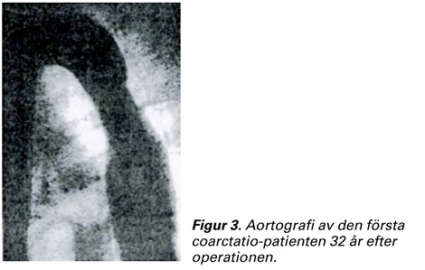Vid operationen skars det förträngda partiet av aorta bort tillsammans med det oblitererade ductus-ligamentet (Figur 2). De bägge aortasegmenten anastomoserades sedan med en fortlöpande silkesutur (ad modum Carrel). Frånsett viss feber var det postoperativa förloppet komplikationsfritt. Patienten kunde skrivas ut från sjukhuset efter 14 dagar. Blodtrycket var då normalt i övre och nedre kroppshalvan. Han har senare i livet spelat mycket fotboll och lär även ha fått en medalj i boxning. Vid en kontroll 32 år efter operationen på Karolinska sjukhuset var hans hälsotillstånd mycket gott. Blodtrycket i ben och armar var 135/85 mm Hg. En aortografi visade att det bara fanns en lindrig förträngning av aortan kvar på platsen för den tidigare gjorda suturen (Figur 3) [1]. Två veckor senare opererade Crafoord ytterligare en patient, en 27-årig lantbrukare. Även det gick bra. De bägge fallen beskrevs i Svensk kirurgisk förening i november 1944 och påföljande år i den amerikanska tidskriften Journal of Thoracic Surgery [2].