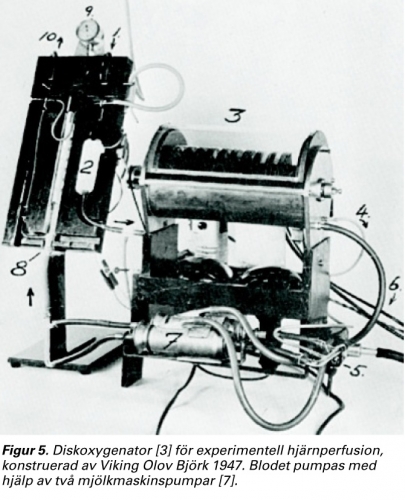 En av Crafoords då nyanställda medarbetare, Viking Olov Björk, blev anförtrodd uppgiften att försöka konstruera en liknande apparat som Gibbons men med en annan metod för syresättning av blodet. År 1948 hade han en apparat klar, en diskoxygenator med två pumpar som kunde syresätta blod till hjärnan hos hundar i upp till 30 minuter (Figur 5) [7].