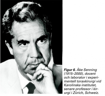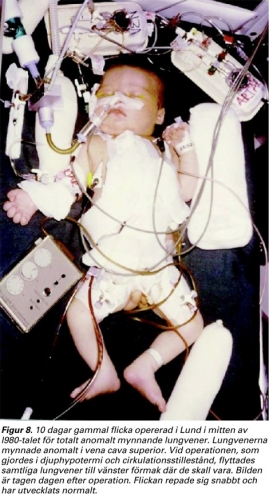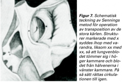 Transposition av de stora kärlen (TGA), en av de mest allvarliga hjärtmissbildningarna i nyföddhetsperioden, hade i slutet på 1950-talet börjat opereras i USA med tekniker som syftade till att förbättra blodblandningen i hjärtat, främst med operativt anläggande av förmaksseptumdefekt. Någon metod för att »omdirigera blodet helt« så att det arteriella blodet kom ut i aorta fanns inte. Det var därför en sensation när Senning och medarbetare 1958 meddelade att de lyckats utföra en »totalkorrektion« av TGA genom att göra en plastik med lambåer av förmaksvägg och septum (Figur 7) [10]. Patienten var en 9-årig underutvecklad pojke med cyanos. Den arteriella syremättnaden var 69 procent. Efter operationen steg den till 94 procent. Patienten levde symtomfri fram till 32 års ålder, då han tyvärr fick en bakteriell endokardit i sitt hemland Polen och avled.