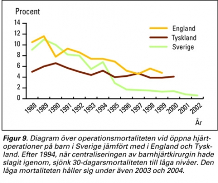 Centraliseringen av barnhjärtkirurgin blev totalt sett mycket lyckosam för Sverige [11]. Resultaten under den senaste 10-årsperioden har präglats av låg dödlighet. (Perioden 1994–2003 opererades 5808 barn med 30-dagarsmortalitet på 1,7 procent). Dödligheten ligger under den som redovisas från andra länder med liknande nationell statistik (Figur 9). År 2002 gjordes totalt 493 operationer på barn (under 17 år) med en 30-dagarsmortalitet på endast 0,6 procent. Även långtidsresultaten är goda. Vid en uppföljning av barn opererade 1996 levde 95 procent fem år efter operationen.