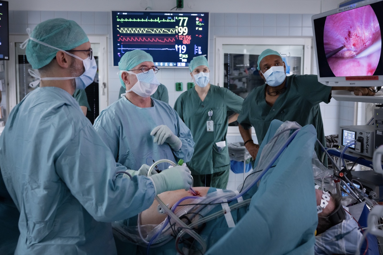 Figur 1. Stimulering av diafragma peroperativt. Från vänster Erik Westin, Raymond Onders, Charlotta Josefson och Moustapha Diop. Foto: Paul Björkman