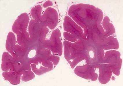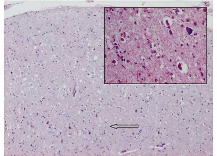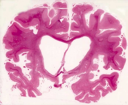 Mikroskopiska fynd. Patologin vid FTD har paradoxalt nog som »karaktäristiskt« drag att vara relativt lindrig och ospecifik, vilket speglas i en diskret nervcellsuttunning i hjärnbarkens yttre tre lager (Figur 2). I vissa fall begränsas degenerationen till frontala områden (lateralt eller på undersidan, frontoorbitalt), i andra fall är den lindriga kortikala skadan utbredd inom stora delar av temporalloberna och når även parietallobernas främre delar. Framträdande är en degeneration inom det limbiska komplexet, speciellt främre cingulum [2, 32].