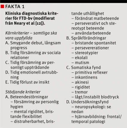 Gemensamt för sjukdomarna inom FTD-komplexet är en progressiv neurodegenerativ process som kliniskt karaktäriseras av personlighetsförändring, beteendesymtom och kognitiv dysfunktion. Språkstörning och motoriska symtom är också vanligt förekommande. Det finns en betydande överlappning mellan de olika undergrupperna, både kliniskt och neuropatologiskt. Det är därför viktigt att tydligt ange huruvida det är ett kliniskt syndrom, den neuropatologiska bilden eller den associerade molekylärgenetiska defekten som avses. Vi kommer att presentera de olika kliniska varianter som ses, därefter den neuropatologiska bilden med molekylärgenetiska aspekter och slutligen diskutera behandling något.