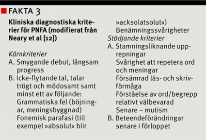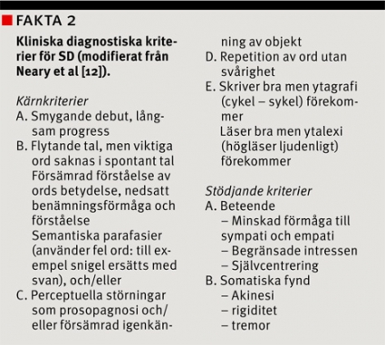 Patienter med semantisk demens har länge ett flytande och grammatiskt korrekt språk. De förlorar dock tidigt och gradvis förmågan både att benämna och att förstå innebörden av enskilda ord. Senare i förloppet tillkommer en beteendeförändring (Fakta 2) [20]. Känneteckande för progressiv icke-flytande afasi är att patienterna gör fonologiska och grammatiska fel. Språket är trögt och mödosamt (Fakta 3).