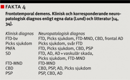 Neuropatologiskt delas FTD in i flera grupper som till stor del motsvarar de nämnda kliniska entiteterna, dock inte helt. FTD (FTD-bv) med specialformen Picks sjukdom, FTD-MND, liksom CBD och PSP, uppvisar ofta avgränsande vävnadstypiska särdrag, där den patologiska bilden svarar mot den ställda kliniska diagnosen. Av dessa kan de kliniska diagnoserna FTD-bv, CBD och PSP emellertid svara mot ett flertal patologier (Fakta 4). De afasipräglade sjukdomsformerna PNFA och SD motsvarar neuropatologiskt en rad sjukdomar (Fakta 4) och har alltså inte en given motsvarighet i en viss hjärnpatologi.