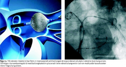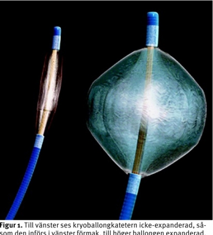 Kryoballongsystemet består av en 15 French (5 mm i diameter) lång styrbar lång introducer genom vilken ablationskatetern (Arctic Front, CryoCath Technologies Inc) förs till vänster förmak. Ballongen expanderas och förs med visst tryck upp mot lungvensostiet. När tillfredsställande position uppnåtts görs kryoablation (Figur 1 och 2). Detta innebär att ballongtemperaturen sänks till ca –50º under fem minuter. Före ablationen registrerades befintlig aktivitet in i respektive lungven. Rutinmässigt behandlades varje lungven med två femminuters applikationer. Vid kvarvarande aktivitet in i en lungven utfördes kompletterande behandling endera med ballong eller med 8 mm kryokateter. Hos 12/40 patienter utfördes avslutningsvis kavotrikuspid istmusablation med radiofrekvensenergi i profylaktiskt syfte mot förmaksfladder, då denna arytmi också fanns dokumenterad.