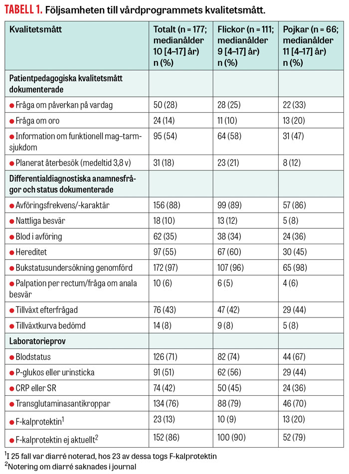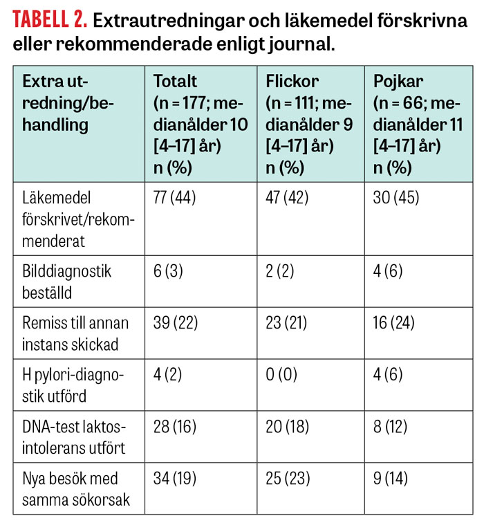 Studiepopulationen bestod av 177 patienter, 4–17 år gamla, varav 63 procent var flickor. Journaler från 15 läkare studerades och antalet patienter per läkare varierade mellan 3 och 24. I Tabell 1 presenteras följsamheten till vårdprogrammets kvalitetsmått. I Tabell 2 redovisas data kring utredningar och behandlingar utanför rekommenderad basutredning, förekomst av remiss till annan instans samt notering av nya besök med samma orsak. Läkemedel ordinerades till 44 procent av patienterna. Laxantia och protonpumpshämmare stod tillsammans för 93 procent av dessa. Medianåldern för patienterna som fått protonpumpshämmare (enbart eller i kombination med laxantia) var 15 år (spridning 9–17 år). För laxantia var medianåldern 9 år (spridning 4–17 år).