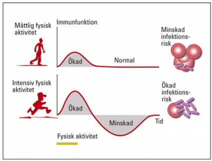 Under såväl lätt, måttligt som intensivt arbete och en kort tid efteråt stimuleras immunfunktionen. I djurförsök har immunstimulering genom akut arbetsbelastning till och med visats förhindra sjukdom av pneumokocker om bakterierna injiceras kort efter arbetets avslutande [12]. Det är dock en tämligen allmänt vedertagen sanning att hårt fysiskt arbete kan resultera i ökad infektionskänslighet. Det beror i huvudsak på en modulering av immunsystemets cellfunktioner. Den kraftiga stimuleringen under ett intensivt arbetspass följs av en tillfällig svacka i infektionsförsvaret. Under denna »immunsystemets återhämtningsfas« är mottagligheten för infektioner ökad (Figur 3).