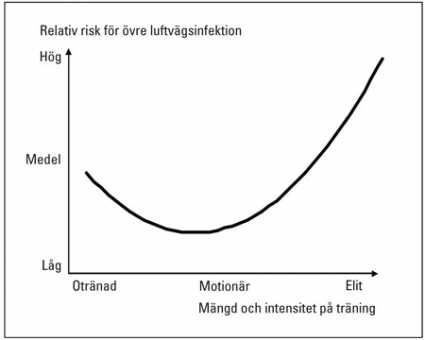 Regelbunden fysisk träning resulterar hos den tidigare inaktive i en förstärkt immunfunktion [13], men endast upp till en viss intensitetsnivå. Om långa och intensiva träningspass kommer alltför tätt, dvs om ett nytt träningspass genomförs under den tillfälliga svackan i immunfunktionen efter föregående arbetspass (Figur 3), kan nästa svacka bli djupare, vilket riskerar att leda till en progressiv immunfunktionsnedsättning om den höga träningsfrekvensen bibehålls. Detta återspeglas i den sk J-kurvan (ibland benämnd U-kurvan) som beskriver frekvensen av luftvägsinfektioner (y-axeln) i förhållande till träningsgrad (x-axeln) (Figur 4). Kurvan bygger på sammanslagna data från studier av medelålders otränade kvinnor och yngre vältränade män [14] och är därför approximativ. En faktor som kan bidra till ökad infektionskänslighet är en minskad koncentration av IgA-antikroppar i saliven. Detta har påvisats både efter långvarigt fysiskt arbete och i vila hos uthållighetsidrottare [1].