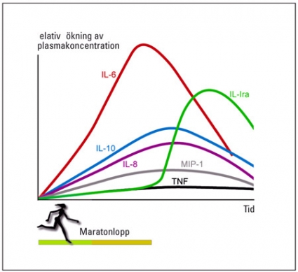 Det har tex visats att frisättningen av interleukin-6 (IL-6) från skelettmuskulaturen efter långvarigt arbete ökar allteftersom muskelns glykogeninnehåll minskar under arbetet [4, 5]. IL-6 stimulerar levern till ökad glukosproduktion. Cytokinkaskaden vid ett hårt fysiskt arbete, tex ett maratonlopp, illustreras av Figur 2. Den liknar i flera avseenden akutfasreaktionen vid bakteriella infektioner och trauma [6].