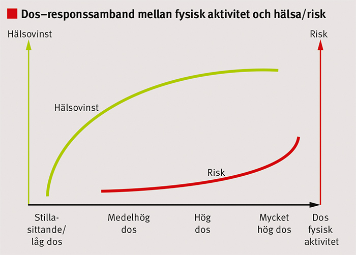 Figur 1. Dos–responssamband mellan fysisk aktivitet och hälsa samt mellan fysisk aktivitet och risker såsom muskuloskeletala skador eller kardiovaskulära komplikationer. Hälsovinsten är störst om man går från låg till medelhög dos av fysisk aktivitet. Risken ökar mest när man går från medelhög/hög till mycket hög dos.