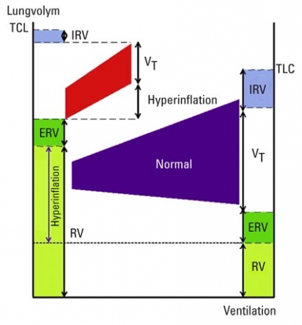 Försämrad lungfunktion och ventilation. Ventilationen i vila hos personer med KOL karakteriseras av sänkta exspiratoriska flöden och hyperinflation. Med hyperinflation menas att den slutexspiratoriska lungvolymen, dvs den volym luft som finns kvar i lungorna efter en normal utandning, är förhöjd. Detta innebär att patienten har ett förhöjt andningsmedelläge och andas kontinuerligt närmare »taket« av sin totala lungkapacitet (TLC) än vad som är normalt. Personer med KOL har dessutom inte sällan en förstoring av hela torax med en åtföljande förstorad total lungkapacitet som följd (Figur 1).