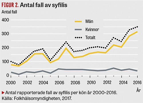 Syfilis är en ovanlig infektion i Sverige, men med en uppåtgående trend sedan år 2000. Under 2016 rapporterades 349 fall av tidig syfilis (Figur 2). Ökande incidens rapporteras i Europa, USA med flera länder, framför allt i gruppen män som har sex med män. Enligt WHO tillkommer globalt årligen 5,6 miljoner fall av tidig syfilis [5].